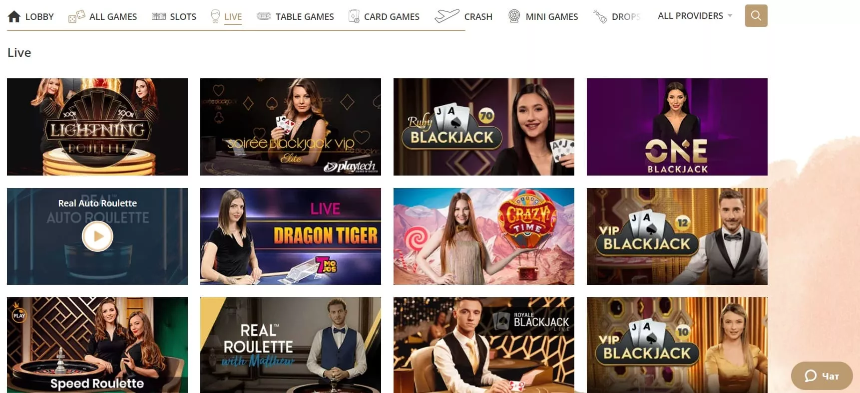 Realistična izkušnja igralnice z igrami v živo, kot so blackjack, ruleta in baccarat v živo, ki jih vodijo profesionalni delivci.