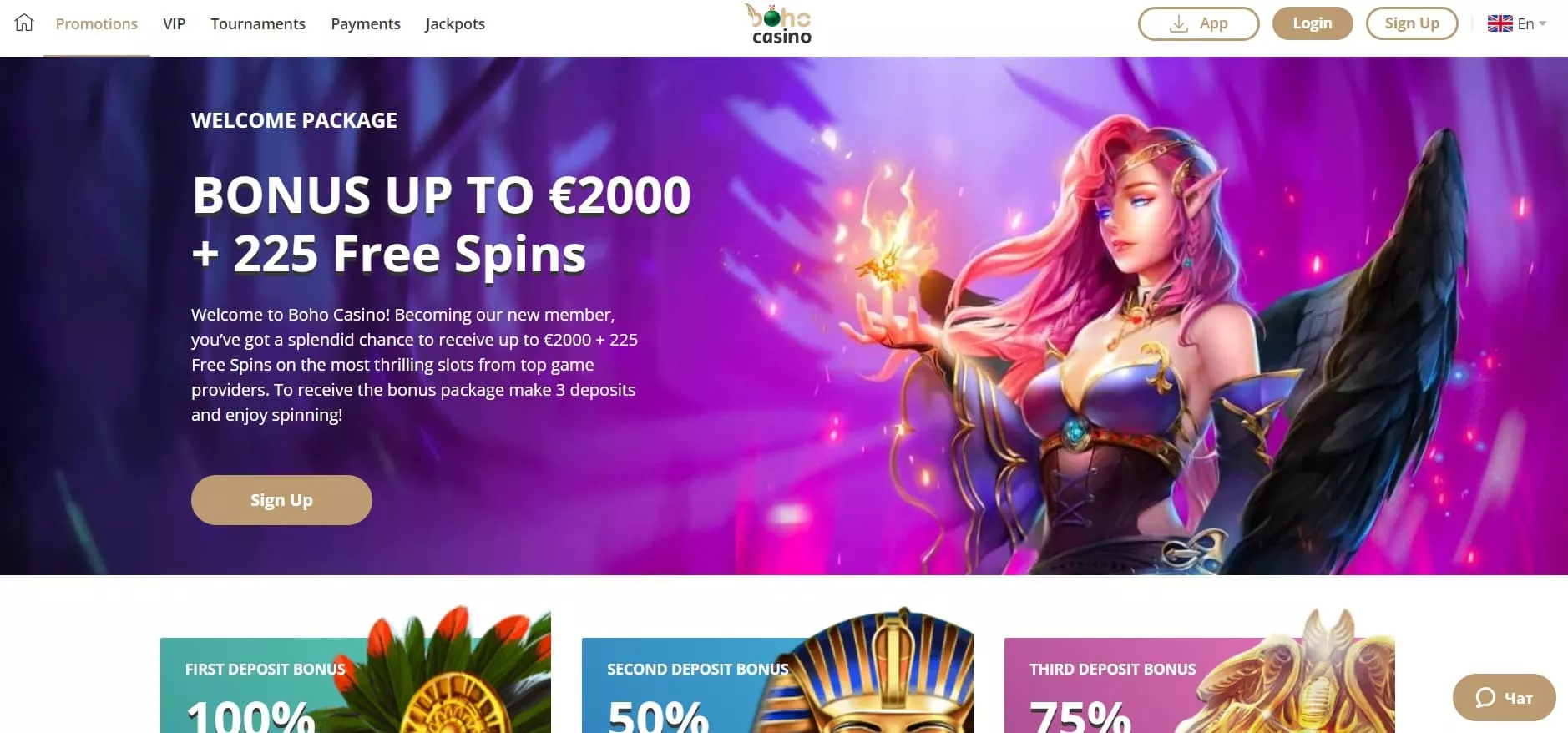 Boho Casino ponuja paket dobrodošlice, ki je razdeljen na prve tri pologe, in omogoča igralcem do 2.000 EUR in 225 brezplačnih vrtljajev.