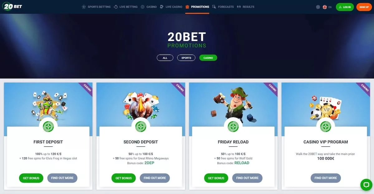 Poleg tega ima 20Bet Casino bonusi za svoje igralce številne privlačne bonuse in promocije, vključno z dobrodošlim bonusom, rednimi promocijami in ekskluzivnimi ponudbami za zveste igralce. Uporabite 20Bet bonus koda za posebne bonuse in ugodnosti, ki vam omogočajo, da povečate svoj začetni depozit in uživate v več igralnih priložnostih.
