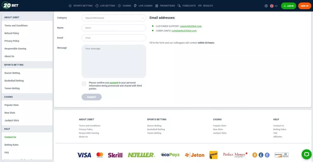 20Bet Casino ponuja zanesljivo podporo strankam, ki je na voljo 24/7. Na voljo imate možnost klepeta v živo, kjer se lahko pogovorite z usposobljenim predstavnikom podpore v realnem času. Poleg tega lahko pošljete e-pošto na support@20bet.com za pomoč pri vprašanjih ali težavah.
