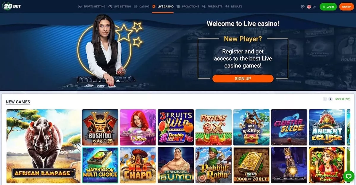 Igre v živo: 20Bet Casino ponuja igre v živo za igralce, ki si želijo bolj pristne izkušnje v igralnici, saj lahko igralci v realnem času igrajo proti pravim krupjejem. Igre v živo vključujejo blackjack v živo, ruleto v živo, baccarat v živo in še več.