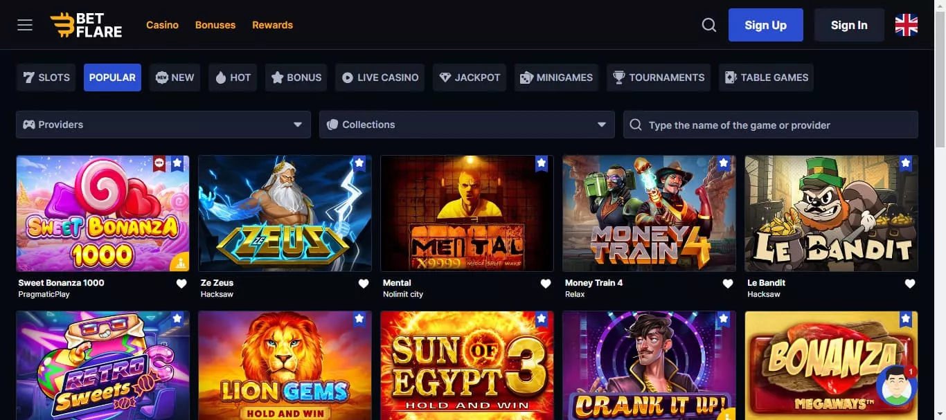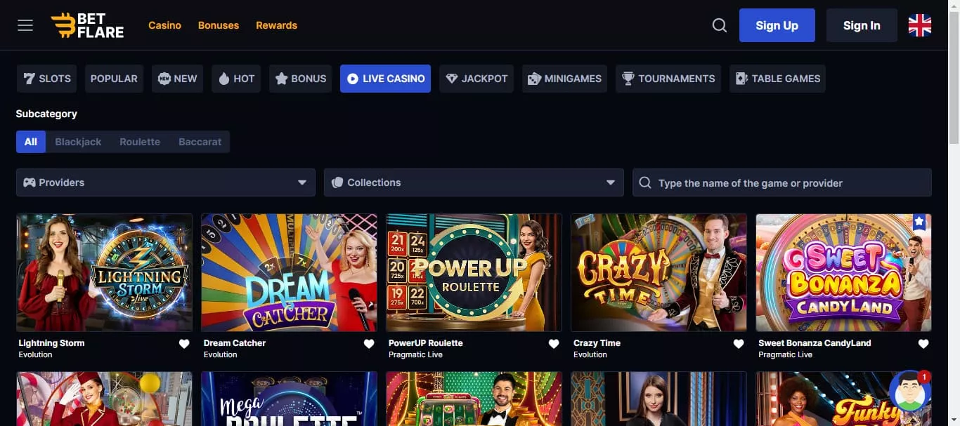 Betflare ima obsežno knjižnico z več kot 7500 igrami najboljših ponudnikov programske opreme, kot so Pragmatic Play, NetEnt in Evolution Gaming.