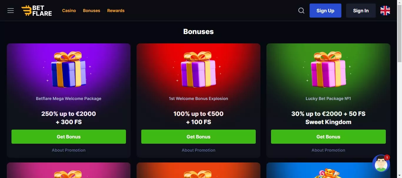 Kot vidimo, Betflare ponuja kombinacijo usklajenih bonusov za pologe, brezplačne vrtljaje in ponudbe za vračilo denarja. Vendar pa lahko rečemo, da je stavna zahteva za večino kar visoka. Izkoristite online casino bonusi, ki vam omogočajo dodatna sredstva za igranje in povečajo vaše možnosti za večje zmage pri vaših najljubših igrah.