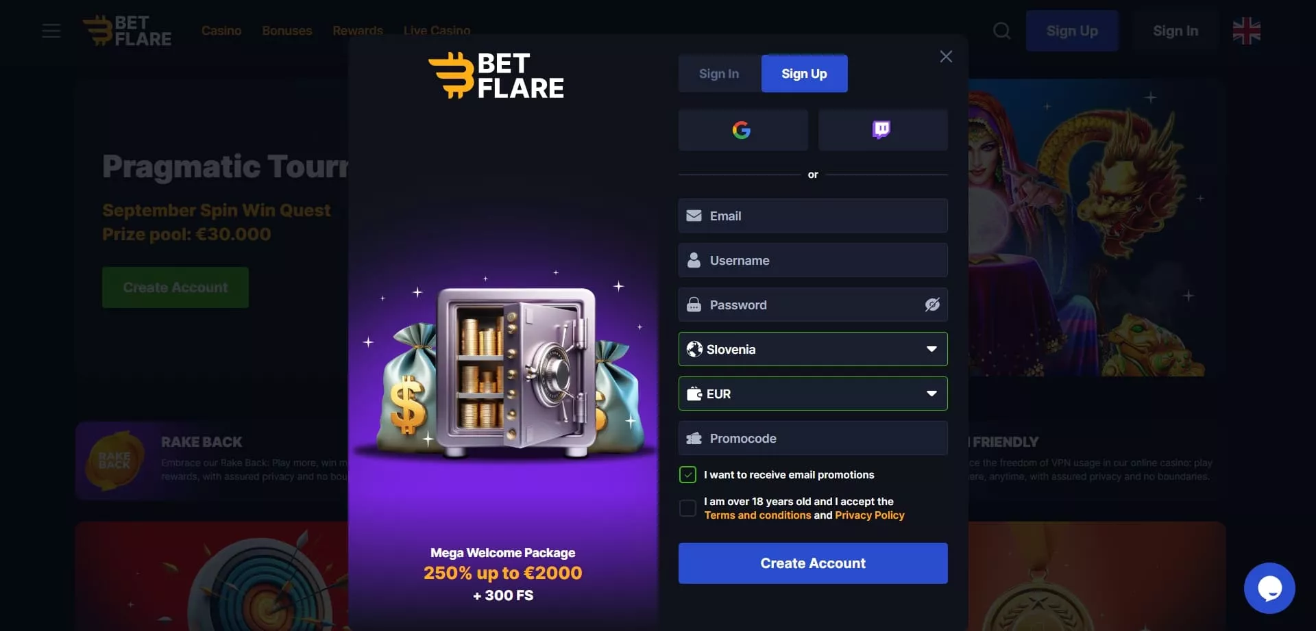 Če se želite prijaviti v Betflare Casino, pojdite na domačo stran igralnice in kliknite na gumb “Register”, ki se običajno nahaja v zgornjem desnem kotu. Za dostop do računa vnesite svoje uporabniško ime in geslo. Prepričajte se, da so vaši podatki pravilni, in če imate težave, lahko geslo ponastavite z možnostjo “Forgot password”.