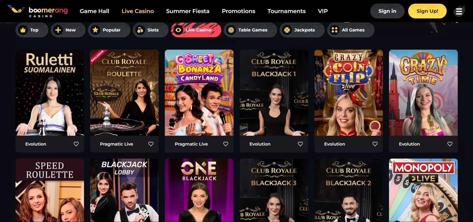 Ko govorimo o igrah v živo, Boomerang casino Slovenija ponuja izjemno sekcijo z igrami v živo, ki jih poganjajo priznani ponudniki, kot so Evolution Gaming in Pragmatic Play. Igralci se lahko v realnem času potopijo v igre z profesionalnimi živimi delivci, doživljajoč vzdušje iger, kot so živi blackjack, živa ruleta in živi baccarat. Poleg tega igralnica ponuja tudi edinstvene igre v živo, kot so Crazy Time in Monopoly Live, kjer se igralci lahko vključijo v interaktivno in zabavno igranje. Igre v živo v Boomerang Casino združujejo udobje spletnega igranja s pristnim vzdušjem tradicionalnih igralnic, kar zagotavlja nepozabno izkušnjo igranja.