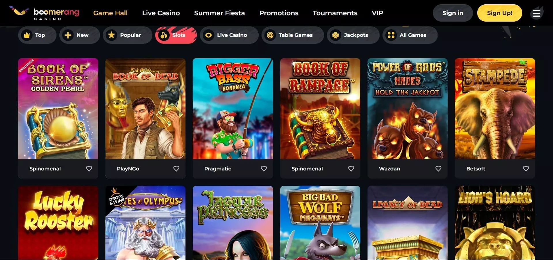 Širok izbor iger: Boomerang Casino ponuja raznolik izbor iger, vključno s priljubljenimi igralnimi avtomati, miznimi igrami in možnostmi v živo, kar igralcem omogoča veliko izbiro in zabavo.