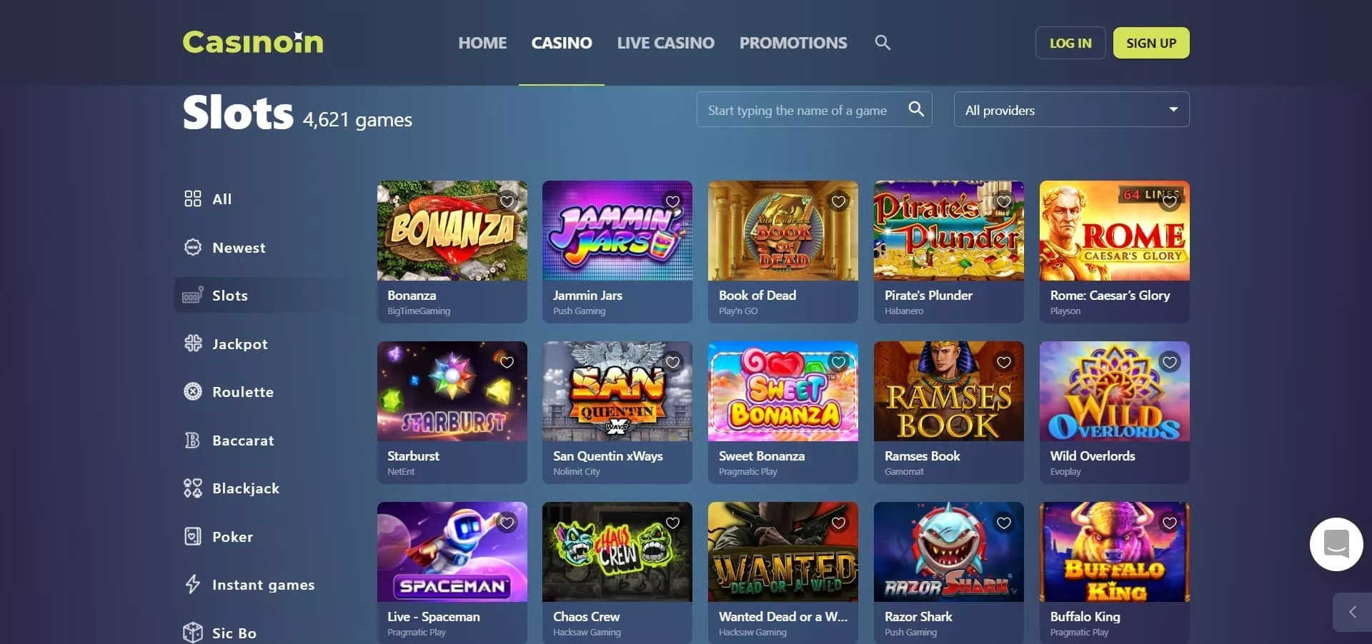 Casinoin Casino ponuja raznoliko izbiro igralnih avtomatov, vključno z 3D avtomati, klasičnimi avtomati, progresivnimi jackpot avtomati in video avtomati. Med najbolj priljubljenimi naslovi najdemo “Starburst” (NetEnt), “Book of Dead” (Play’n GO) in “Gonzo’s Quest” (NetEnt).