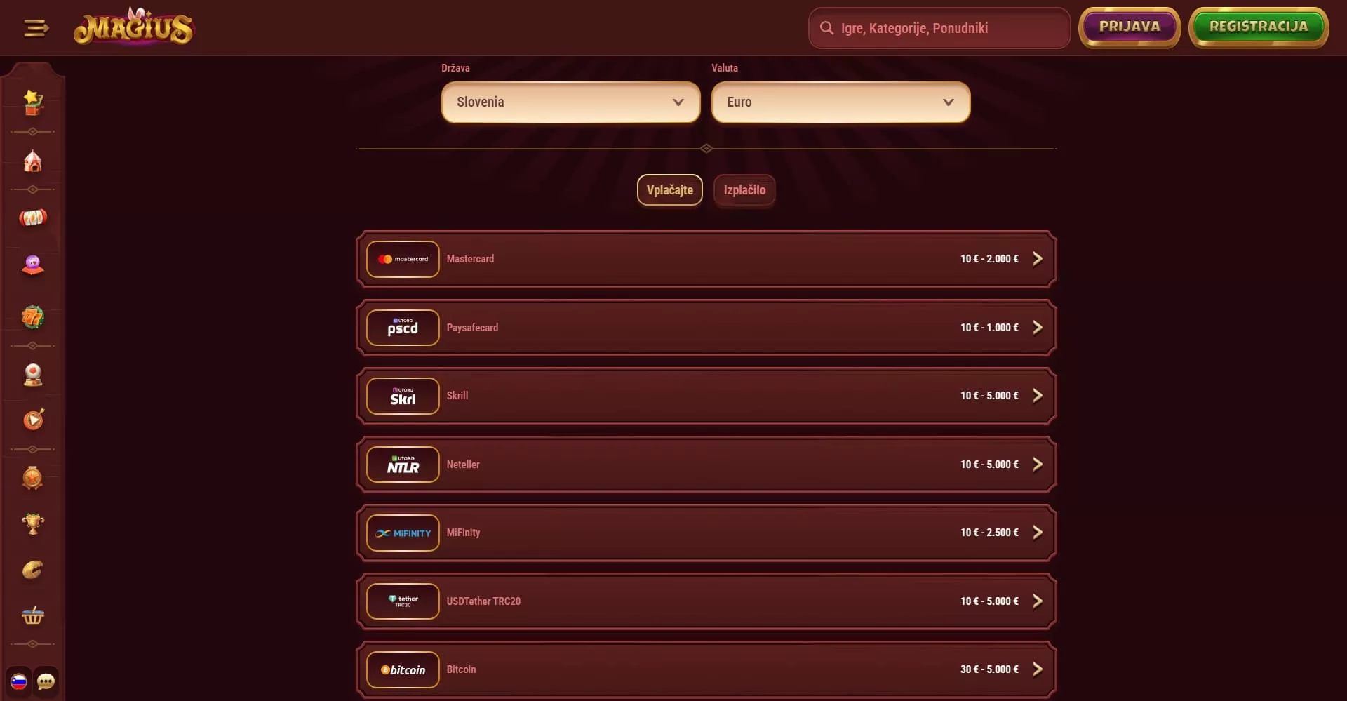 Vplačila in izplačila so ena najpomembnejših funkcij vsake spletne igralnice, saj igralci želijo hiter, varen in preprost način upravljanja s svojim denarjem. Magius Casino se tega dobro zaveda in zato ponuja široko paleto zanesljivih plačilnih metod, ki omogočajo enostavne transakcije. Tako vplačila kot izplačila so zasnovana tako, da uporabnikom zagotavljajo maksimalno udobje, pri čemer je varnost vedno na prvem mestu.