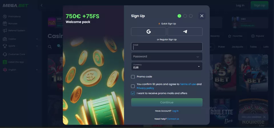 Če se želite registrirati račun v spletni igralnici Mega.bet , obiščite uradno spletno stran in kliknite na gumb “Register“, ki se običajno nahaja v zgornjem desnem kotu domače strani. Vnesite svoj registrirani e-poštni naslov in geslo, nato pa potrdite svoje podatke, da pridobite dostop do svojega računa in začnete igranje v spletnem kazinu Mega.bet za pravi denar.