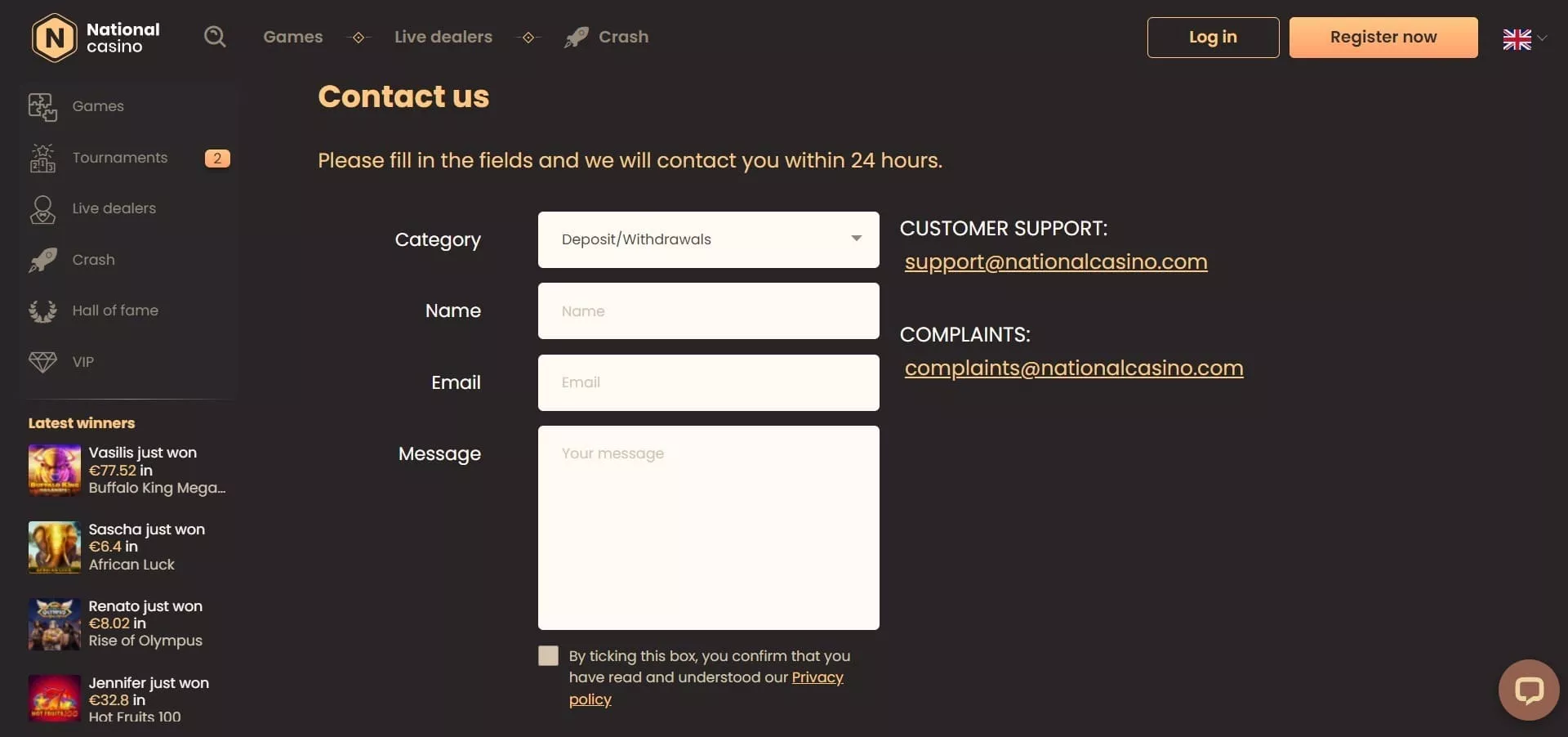 National casino zagotavlja podporo strankam preko klepeta v živo, kar je enostaven način za komunikacijo in reševanje vprašanj. Ekipa podpore je na voljo 24 ur na dan, 7 dni v tednu, kar pomeni, da lahko igralci dobijo pomoč kadarkoli jo potrebujejo. Čeprav je odsek Pomoč, Vprašanja in Varstvo zasebnosti (PZV) nekoliko kratek in omejen, ekipa podpore strankam odgovarja zelo hitro, kar igralcem zagotavlja učinkovito in pravočasno pomoč. Ne glede na vprašanja ali težave, ki jih imate, se lahko zanesete na odzivno in prijazno podporo National casinoja.