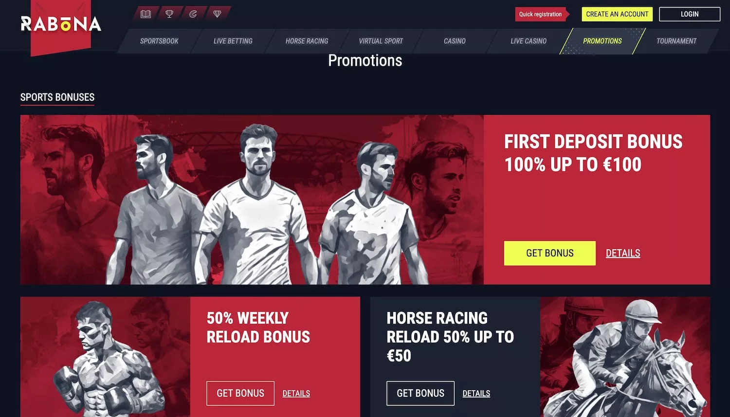 Rabona Casino svojim novim strankam ponuja dobrodošli bonus ob prvem pologu. Za prejem tega bonusa mora igralec vsakič odigrati celoten znesek prvega pologa s kvoto, ki ni nižja od 1,50. Minimalni polog znaša 20 €, pri čemer prvi polog prinese 100% bonus do 100 €.