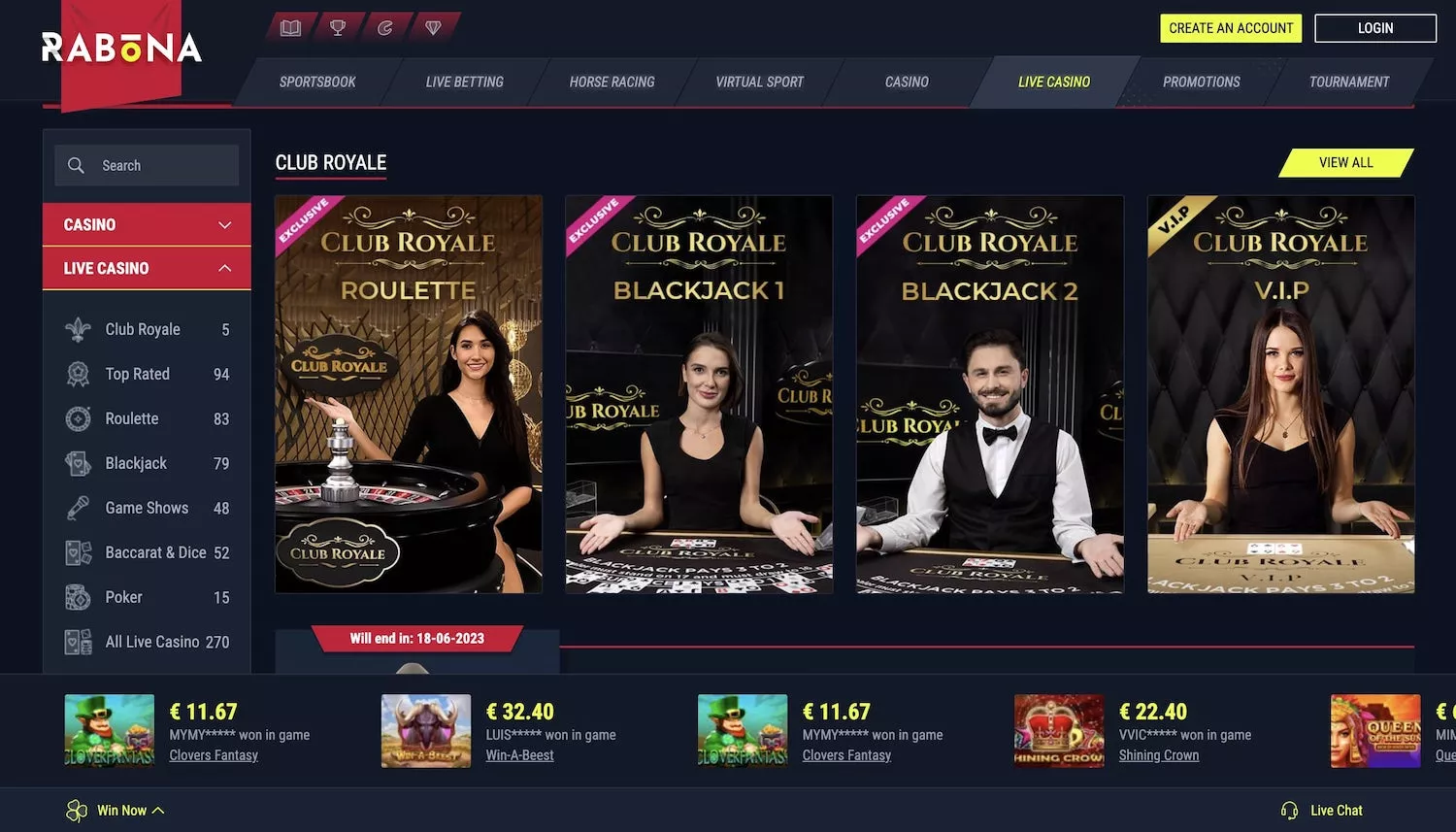 V živo kazino sekciji Rabona Casino prinaša resnično vzdušje igralnice v udobje domačega okolja. Igralci se lahko pomerijo v priljubljenih igrah v živo, kot so živi blackjack, živa ruleta, živi bakara in še več. Sodelujejo lahko s profesionalnimi krupjeji v realnem času, kar ustvarja izkušnjo igranja, ki je čim bliže obisku fizične igralnice.