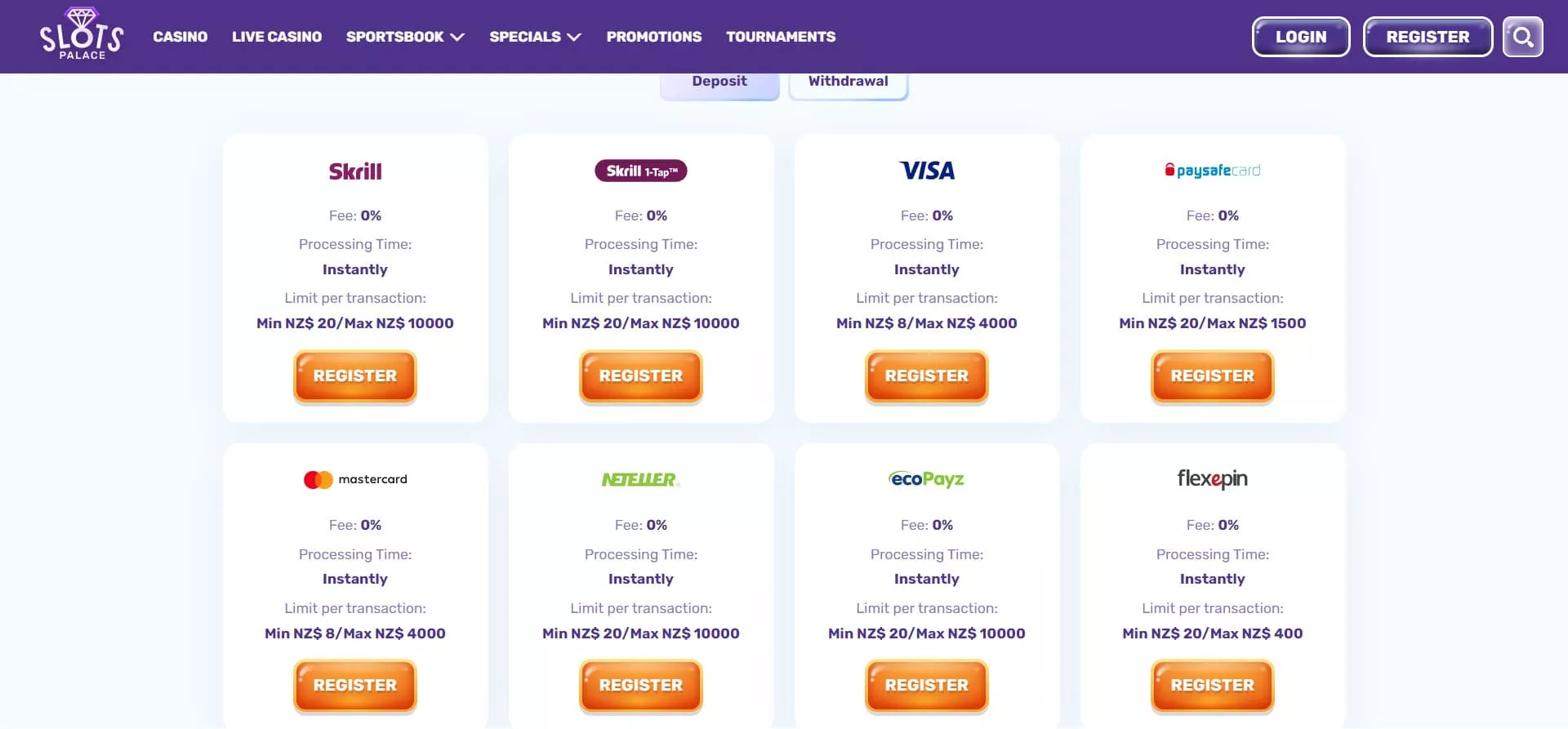 Ko gre za načine plačila, SlotsPalace ponuja raznolik izbor zanesljivih in priročnih možnosti. Igralci lahko izbirajo med zaupanja vrednimi ponudniki, vključno s kreditnimi/debetnimi karticami, elektronskimi denarnicami in varnimi bančnimi prenosi, kar zagotavlja gladke in varne transakcije.