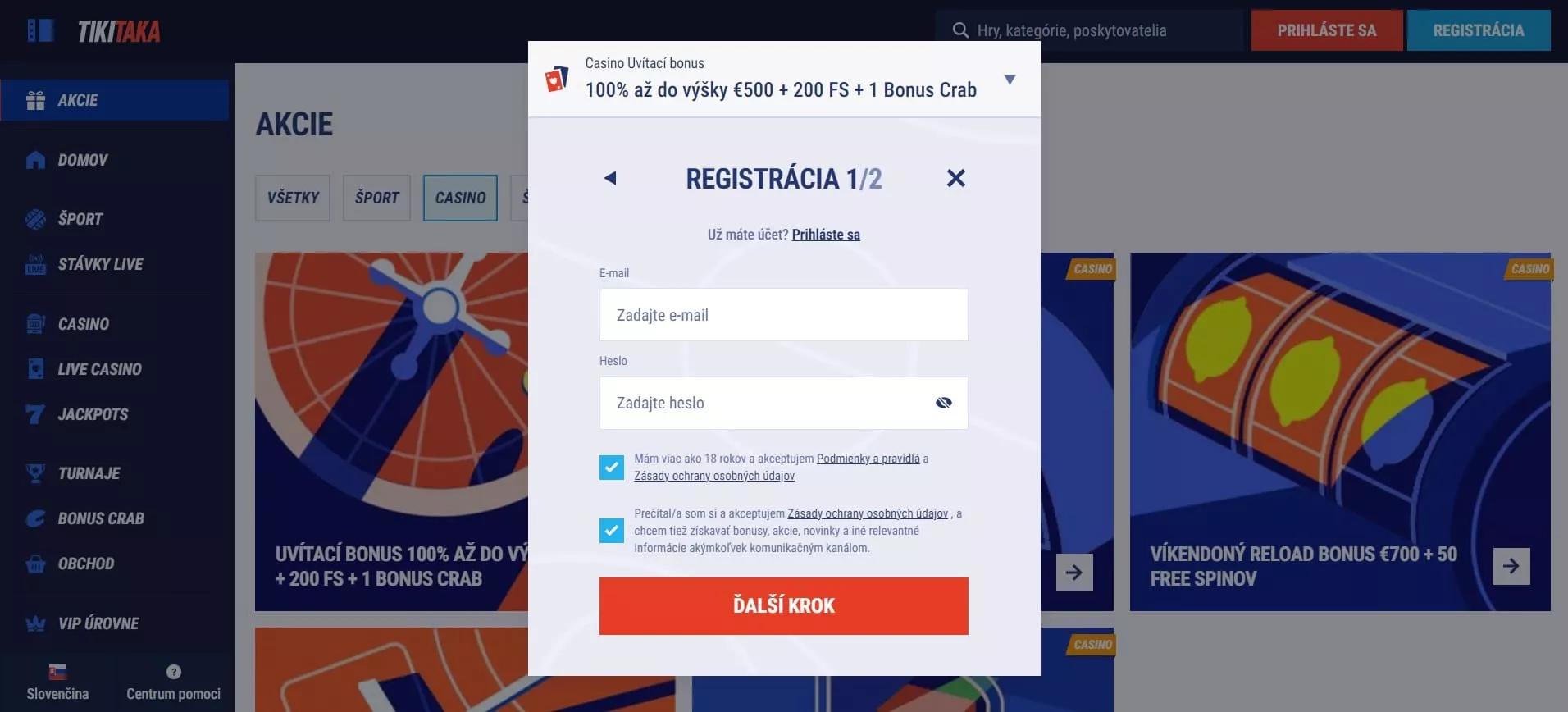 Prijava v spletno igralnico Tikitaka je preprosta. Preprosto obiščite domačo stran igralnice, kliknite na gumb “Sign up” v zgornjem desnem kotu ter vnesite svoj e-poštni naslov in geslo.