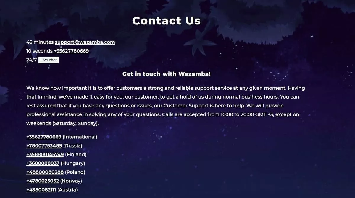 Wazamba Casino je zavezana zagotavljanju odlične podpore strankam, ki je na voljo za reševanje vseh vprašanj in težav, s katerimi se igralci srečujejo. Ekipa za podporo strankam je prijazna, strokovna in odzivna. Igralci lahko stopijo v stik s podpornim osebjem prek več načinov komunikacije, vključno z e-pošto in klepetom v živo. E-poštni naslov za podporo strankam je na voljo na spletni strani casinoja, kjer lahko igralci pošljejo svoja vprašanja, povratne informacije ali zahtevajo pomoč. Klepet v živo pa omogoča takojšnje komuniciranje z ekipo za podporo strankam v realnem času. Wazamba Casino se trudi zagotoviti vrhunsko izkušnjo strankam in zagotoviti, da so vsi igralci zadovoljni in podprti v svojem igralnem procesu.
